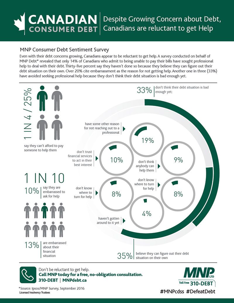 September 30, 2016 - Even with their debt concerns growing, Canadians appear to be reluctant to get help. A survey from MNP Debt revealed that only 14 per cent of Canadians who admit to being unable to pay their bills have sought professional help to deal with their debt. Thirty-five per cent say they haven’t done so because they believe they can figure out their debt situation on their own. Over 20 per cent cite embarrassment as the reason for not getting help. Another one in three (33 per cent) have avoided seeking professional help because they don’t think their debt situation is bad enough yet.